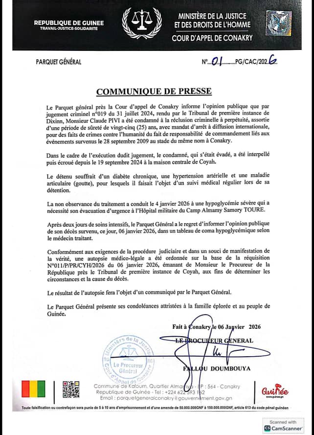 Le Parquet général près la Cour d’appel de Conakry a annoncé dans la soirée du mardi 6 janvier, le décès de Claude Pivi, condamné pour crimes contre l’humanité dans le procès du massacre du 28 septembre 2009. Décédé à l’hôpital militaire du camp Almamy Samory Touré après une hospitalisation d’urgence, le détenu souffrait de pathologies chroniques, selon les autorités judiciaires, qui ont ordonné une autopsie médico-légale afin de déterminer les circonstances exactes de sa mort.