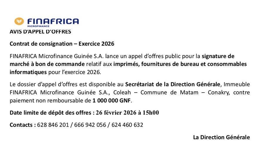 FINAFRICA Microfinance Guinée S.A: AVIS D’APPEL D’OFFRES Contrat de consignation – Exercice 2026
