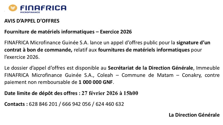FINAFRICA Microfinance Guinée S.A: AVIS D’APPEL D’OFFRES Fourniture de matériels informatiques – Exercice 2026