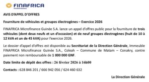 01. FINAFRICA Microfinance Guinée S.A AVIS D’APPEL D’OFFRES Fourniture de véhicules et groupes électrogènes – Exercice 2026