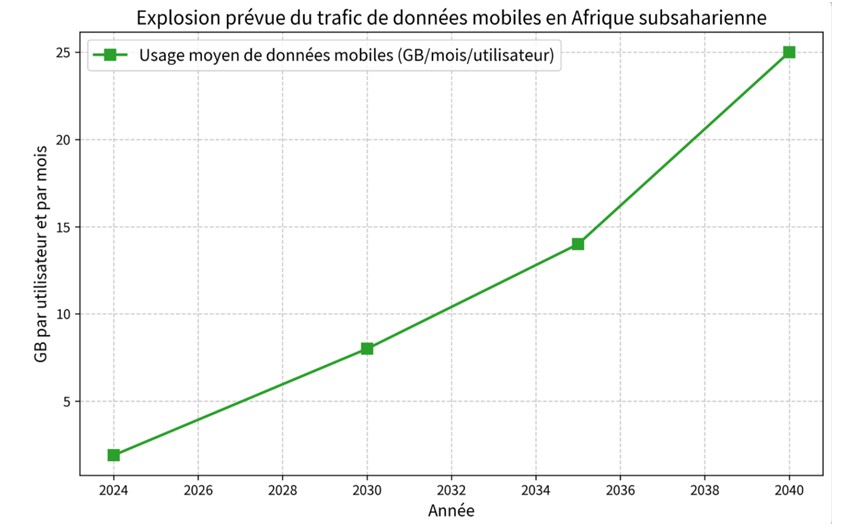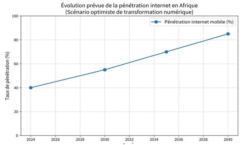 Ces trois graphes (générés à partir des projections GSMA et Ericsson) montrent l’accélération irrésistible du numérique en Afrique. La courbe bleue de la pénétration internet monte en flèche, le trafic data quadruple puis explose, et la contribution numérique au PIB passe d’un complément à un moteur central. On y lit le « redessinage » du social avec le patrimoine (liens physiques, transmission orale) qui perd du terrain face à la data qui devient la nouvelle monnaie relationnelle.
