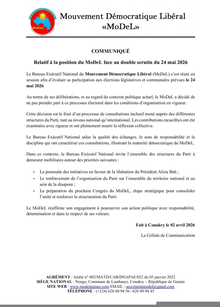 Le Mouvement Démocratique Libéral (MoDeL) a annoncé, dans un communiqué publié ce jeudi 2 avril, sa décision de ne pas participer aux élections législatives et communales prévues le 24 mai prochain. Dans le communiqué, le parti souligne que cette décision résulte d’un processus de consultation interne rigoureux et appelle ses structures à se concentrer sur des priorités stratégiques, notamment la libération du président parti Aliou Bah, qui purge une condamnation de deux ans de prison ferme, le renforcement de l’organisation du parti et la préparation de son prochain congrès.